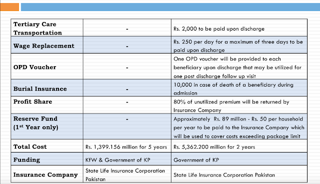 Similarly, transportation charges, wage replacement, free OPD vouchers come in. There is a reserve fund of Rs 89 M for someone crossing upper limit of 300,000 on tertiary care. Funding is exclusively KP Govt and two and a half billion per year. Insurance Company is SLIC after an open competition participated by 8 insurance companies.
